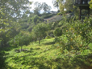 The third slide is the waterworks plan. The fruit trees are now irrigated from the greywater system. Also visible is the placement of the water well on the north and higher side, and the proposed blackwater system on the lower south side, incorporated among the semi tropical fruit trees.